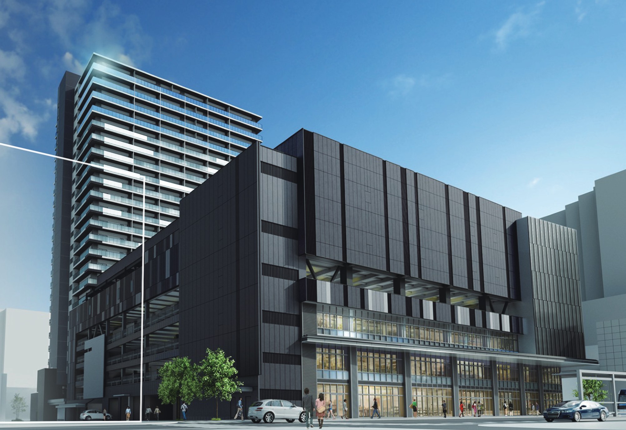 黒を基調とした外観で低層階はガラス張り、2階部分に片面アーケードを設けます。