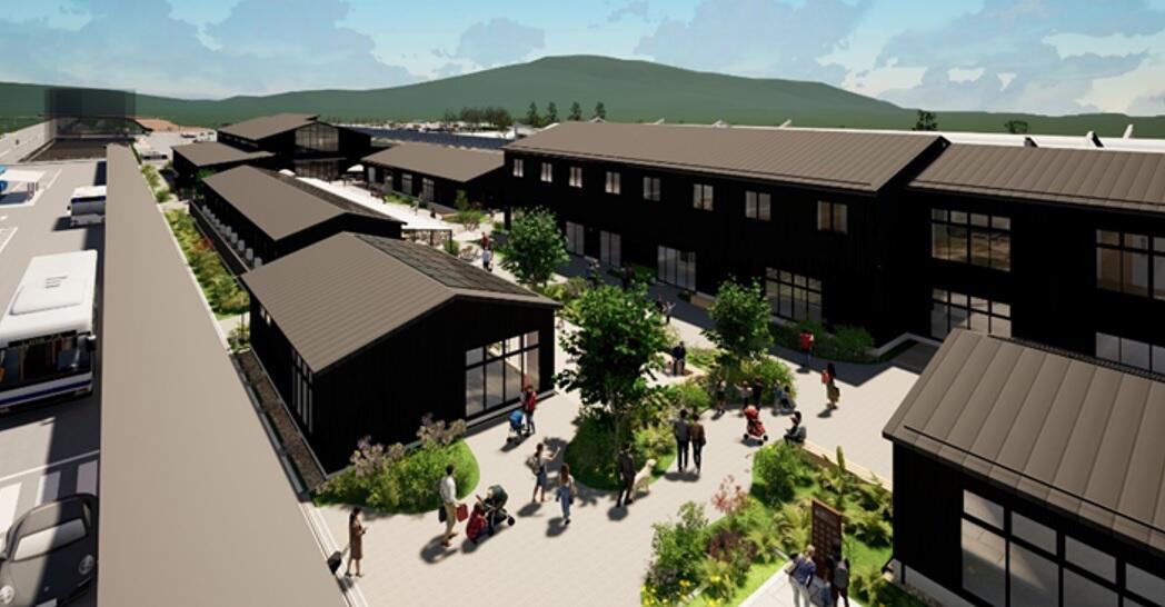 黒を基調とした平屋及び地上2階建ての建物が複数棟建設されます。