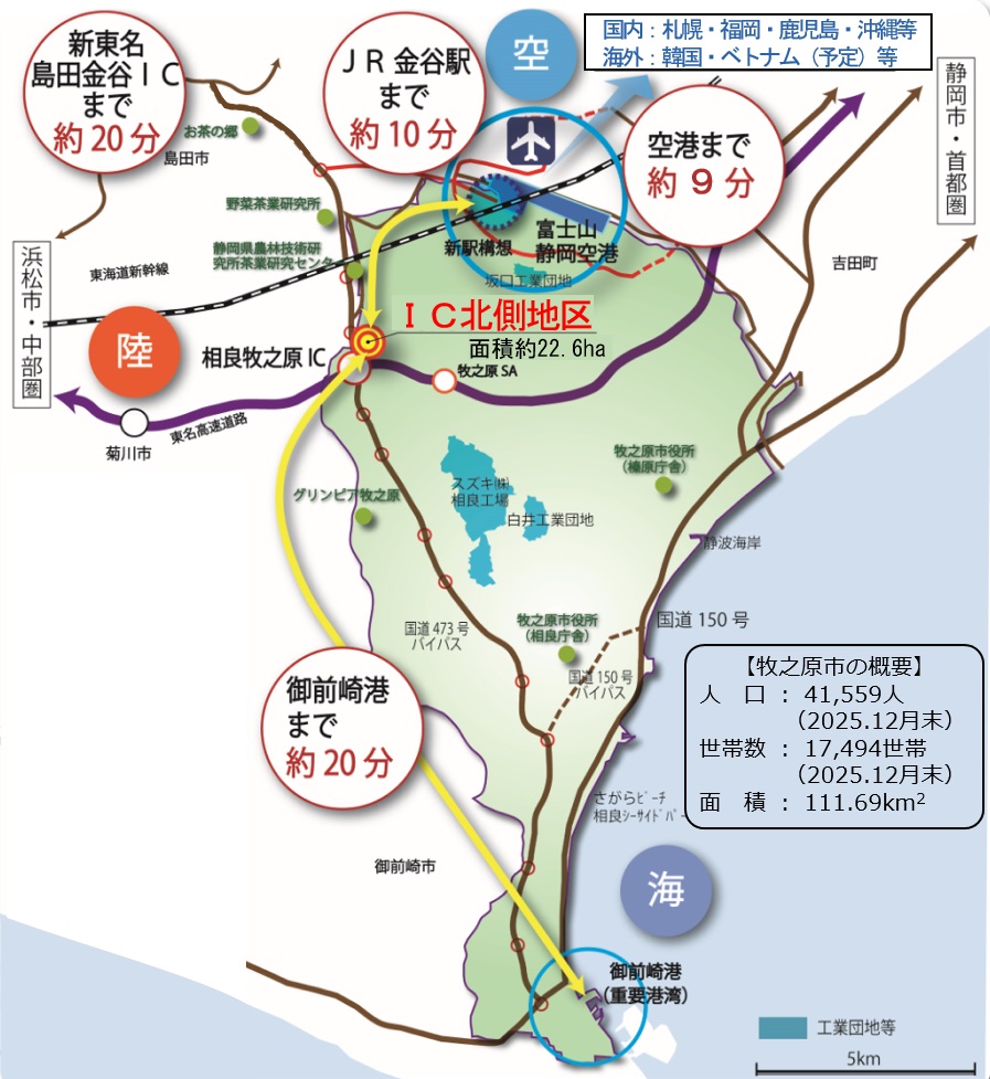 開発予定地は東名高速道路「相良牧之原」インターチェンジの北側エリアの22.6ヘクタールです。高速道路のインターチェンジが隣接しており、さらに富士山静岡空港まで車で約9分と空港にも近く、非常に良い立地であることがわかります。