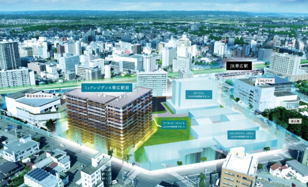 約2万5,000㎡の広大な敷地に、商業施設(3棟)、ホテル、そして十勝最大級となる地上14階建ての高層タワーマンション「ミッドレジデンス帯広駅前」が誕生します!