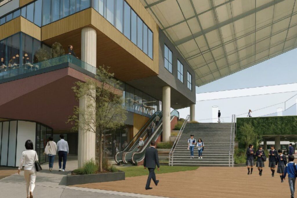駅前南コンコースに大階段等を設け、「近畿大学病院・近畿大学おおさかメディカルキャンパス」(昨年11月開設)や堺市施設「ビッグバン」等につながる2階レベルへの動線を整備し、南海電鉄の新建物とデッキを接続することで、くすのき広場を活用した賑わい空間と、回遊性が高いウォーカブルなネットワークを構築するとのこと。