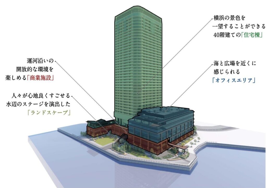 商業施設の詳細は現在のところ明らかになっていませんが、2020年に開業した北仲ノットの商業施設「北仲ブリック&ホワイト」と連結し、馬車道駅からの駅水動線沿いに店舗が並ぶ感じになります。
