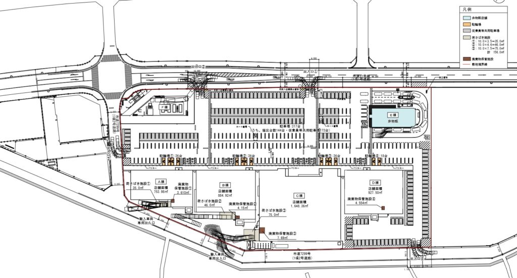 駐車場を挟んで道路に対して奥側には物販棟が4棟建てられます。