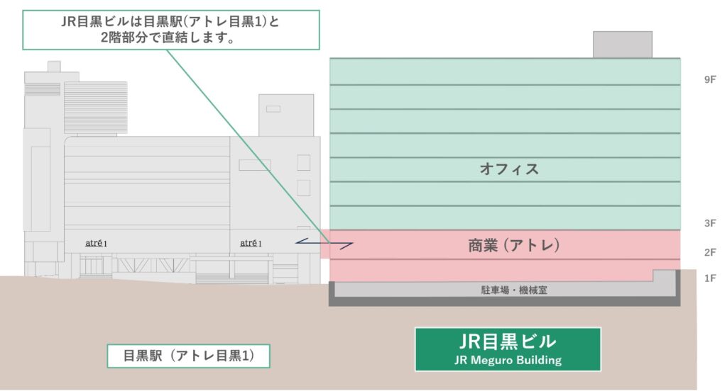 目黒駅にはすでに「アトレ目黒1」「アトレ目黒2」が存在しますが、本ビルはアトレ目黒1と2階の連絡通路で直結するため、アトレの新たな館(増床部分)として機能することが予想されます。