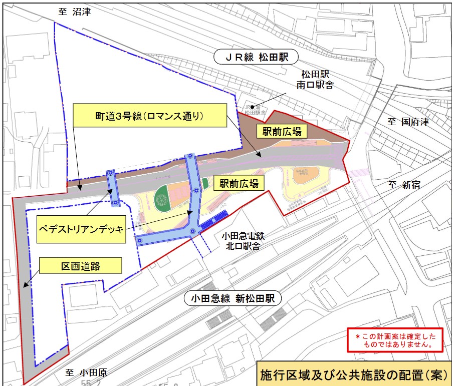 場所は神奈川県足柄上郡松田町松田惣領。小田急小田原線「新松田駅」北口から、JR御殿場線「松田駅」南口にかけての駅前エリア一帯です。